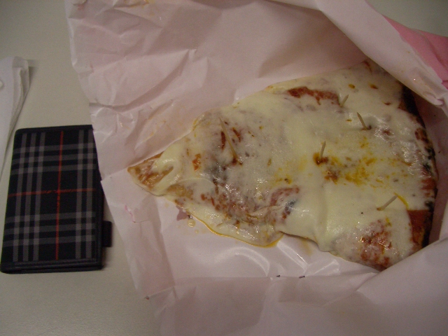 このサイズのピッツァでミニサイズだそうです。窯からの出したて出来たてのを持ち帰り、学校のカフェでいただいています。レストランがメインのお店で、いつもミラネーゼでいっぱいのピッツェリアなのです。